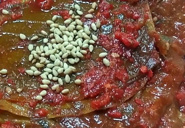 부북면 위양마을 손희경 님께서 직접 콩밭에서 따고 소금물에 절여 준비한 단풍 든 콩잎을 정임출 님께서 차곡차곡 양념 발라 담아주시는 산초향이 별미인 장아찌입니다.
