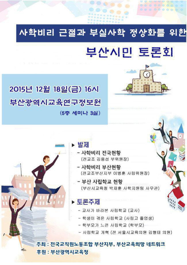 오늘(12.18.금) 16시 전교조부산지부와 부산교육희망네트워크 주최 ‘사학비리 근절과 부실사학 정상화를 위한 부산시민 토론회’가 예정되어 있습니다.