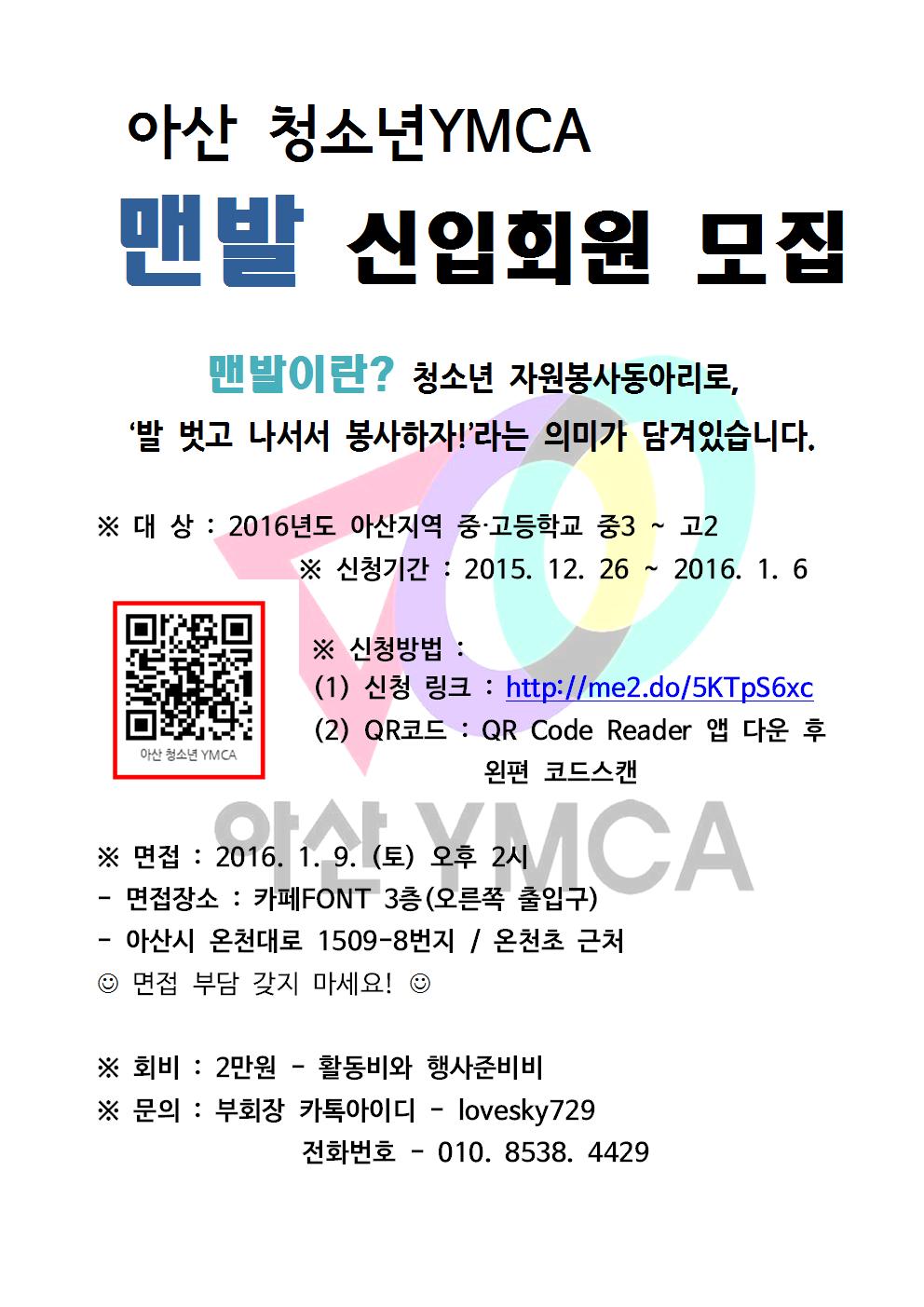 2016년도 아산 청소년YMCA <맨발> 신입회원 모집합니다! :D