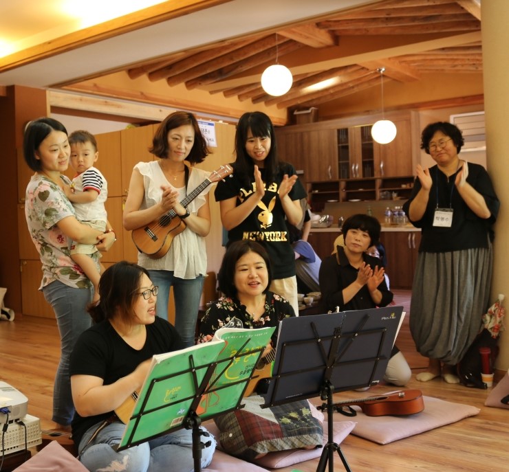 ‘설탕 발린 누룽지들의 우쿨렐레 발표회’라는 이름에서 글자 하나씩을 따왔어요. 그냥 누룽지는 심심한테 설탕 바르면 더 고소하고 바삭해지잖아요. 우리 평범한 일상도 특별하게 바꿔 보자는 의미였죠. 모두 아이 키우는 엄마인데, 이곳에서만은 온전히 나만의 시간을 보낼 수 있어요. 사정이 여의치 않으면 아이도 데려와요. 무엇보다 좋은 건 같이 할 수 있다는 거예요. 잘하든 못하든 밀어 주고, 끌어 줘서 든든해요.