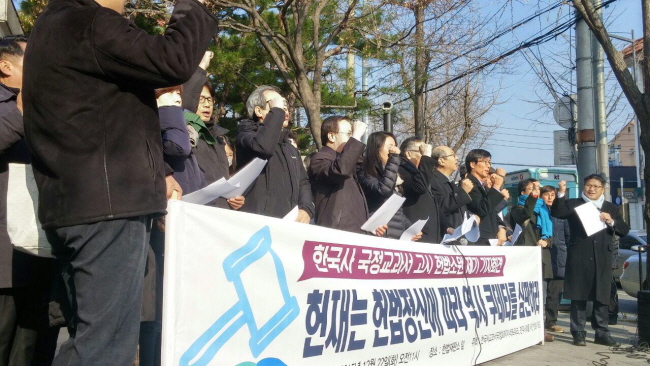 전교조가 연대하고 있는 '한국사 교과서 국정화 저지 네트워크'는 ‘민주사회를 위한 변호사 모임’과 함께 '한국사 국정교과서 고시 헌법소원 제기 기자회견'을 2015년 12월22일(화) 오전 11시 헌법재판소 앞에서 가졌습니다.