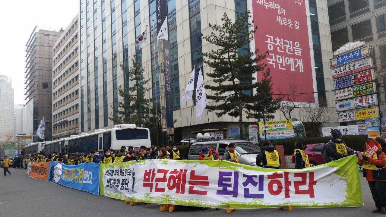 조상수 공공운수노조 위원장은 “16일 하루파업에 이어 19일 3차 총궐기를 각 지역에서 성사시키고 오늘 다시 국회 앞에 모였다”고 전하고 “민주노총의 끈질긴 투쟁에 박근혜 정권이 선수를 교체해 이 정권의 실세인 최경환이 4대 개혁, 노동개악을 완수하지 못하고 물러났고 유일호 경제부총리를 내정했다”면서 “어제는 정의화 국회의장에게 상공회의소 의장들이 직권상정을 압박했고 경제5단체도 압박했는데 우리도 2박3일 간 그들을 압박하고, 다음주 80만 조합원의 총파업으로 국민 여론을 움직이자”고 성토했다.