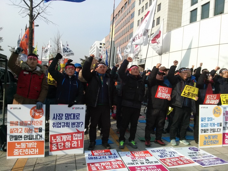 재벌의 이해를 대변하고 있는 노동 개악 관련 법제정을 위해 정부와 여당은 수단과 방법을 가리지 않고 있다. 여야 빅딜, 직권상정, 경제명령 등 온갖 꼼수를 총동원하고 있다. 이에 민주노총은 총파업 태세를 유지하기로 결정했다. 12월 28일부터 30일까지 가맹조직 순차 파업에 돌입하며, 29일은 전국의 파업대오가 서울에 모여 총파업대회를 개최한다. 특히 보건의료노조는 28일 점심 시간을 이용하여 “보건의료노조 총파업 총력투쟁” 로비 집회를 개최하기로 했다.