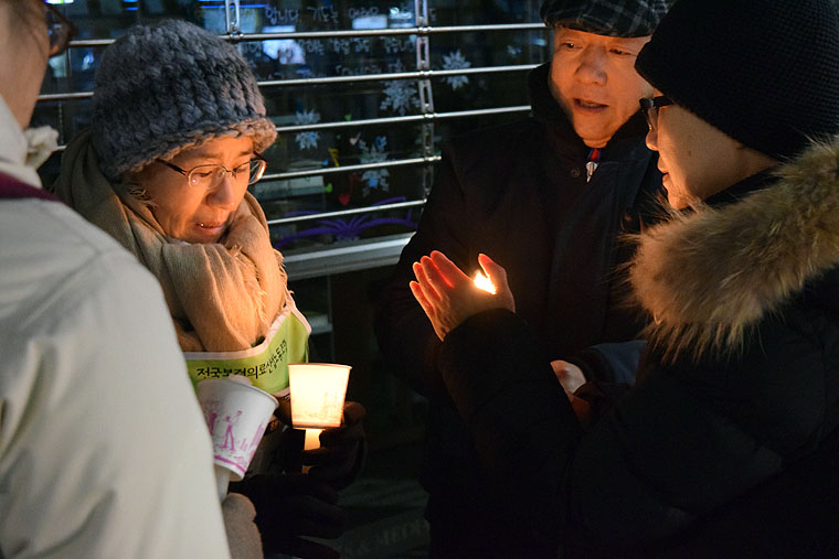 저녁 촛불집회에서 보건의료노조 박민숙 부위원장은 집회 발언을 통해 “지난주 농성장이 칼과 가위로 짓겨지던 그때, 최기산 주교는 성탄 메시지를 발표했다. 최기산 주교는 오늘 우리가 살아가는 이 지구 안에는 자비가 간절히 요구되고 있다고 말했다. 그러나 왜 우리 여성노동자들에게는 자비를 배풀지 않는 것인지 묻고 싶다. 우리는 연내에 사태가 해결 되기를 바란다. 인천교구의 결단만이 남아있다.”고 밝혔다.