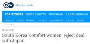 반면 외신은 다르다. 외신들은 이번 합의가 위안부 피해 할머니들의 입장이 반영되지 않았다고 적고 있다. 독일의 소리 방송인 도이체 벨레 역시 12월 30일 위안부 합의 소식을 타전하면서 “피해 할머니들 대부분이 반대했다”고 전했다. 도이체 벨레는 그러면서 아베 역시 극우 및 일부 언론으로부터 역풍을 맞고 있다고 전했다.