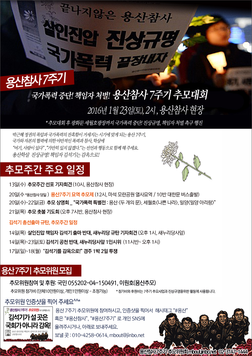 오는 2016년 1월 20일은 국가와 자본의 폭력에 의해 다섯 철거민 민중열사들이 돌아가신 용산참사 7주기가 되는 날입니다.