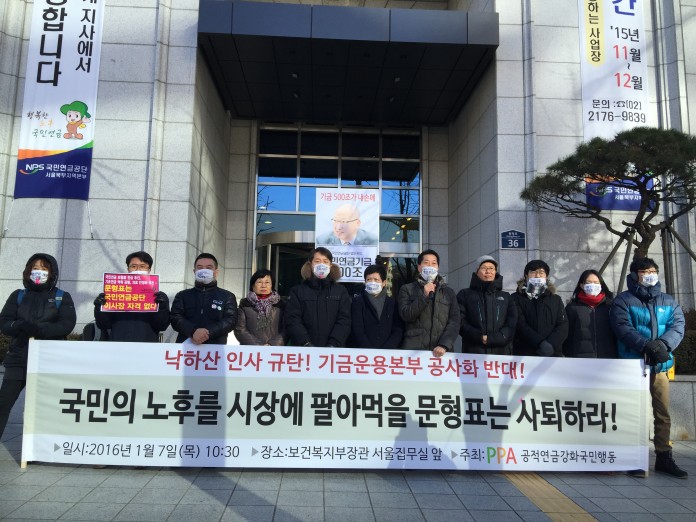 국민들의 소중한 노후자금인 국민연금기금 역시 마찬 가지다. 장관 시절 문형표는 전문성과 수익성을 명분으로 기금운용본부의 공사화를 골자로 하는 기금운용체계 개편을 추진해왔다. 그러나 기금운용본부 공사화는 국민연금기금을 투기자본화 하고, 가입자 대표의 참여를 배제하며, 제도로부터 기금을 분리해 기금운용에서 정부 경제부처의 개입을 높이겠다는 것에 지나지 않는다. 국민연금기금을 금융재벌과 정부 경제부처에 넘겨 국민 노후를 위험에 빠뜨릴 것이다.