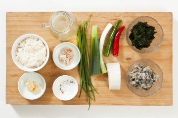 굴 300g, 미역 2g, 무 100g, 부추 조금, 홍고추 1개, 풋고추 1개, 대파 1/4대, 새우젓 1큰술, 소금, 다진마늘 1/2큰술, 멸치다시마육수 6컵, 식은밥