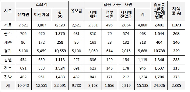 이런 주장에 대해 교육부는 교육청의 ‘예산이 충분’하다고 맞서고 있다. 교육부는 최근 전국 교육청 예산을 점검한 결과를 내놓았다(교육부 보도자료, “2016년 시도교육청 본예산 분석 결과 발표”, 2016.1.11.). 그 결과에 따르면, 서울, 광주, 세종, 경기, 강원, 전북, 전남 등 누리과정 예산을 편성하지 않은 시도의 전체 누리과정에 써야할 재정은 총 2조 2591억 원이다. 교육부 점검결과에 의하면, 유치원 누리과정 예산을 유보금 항목으로 확보한 9788억 원 이외의 비용은 충분히 교육청에서 마련할 수 있다는 주장이다. 주요 지역의 교육청 자체재원, 정부지원, 지자체전입금 등, 활용 가능한 재원이 1조 5138억 원으로 유보금과 합하면 총 2조 4926억 원이 된다고 전한다. 이 결과로 본다면 교육청은 누리과정 예산을 제외하고도 2335억 원 가량의 여윳돈이 있음에도 편성하지 않고 버티는 꼴이다(표1 참고).
