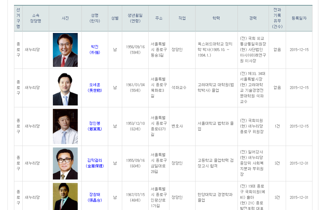 선관위 청원 - 국회의원 예비후보자들의 공식 이메일과 홈페이지를 알고 싶습니다