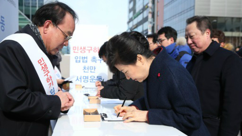 어제(19일) 박근혜 대통령은 대한상공회의소 · 전국경제인연합회(전경련) 등이 주도하는 ‘경제 관련 입법’ 촉구를 위한 1천만 서명운동에 직접 참여했다. 하지만 이번 서명의 주도단체는 기업의 이익을 대변하고 있다. 특히 전경련은 재벌을 위한 이익단체이다. 이런 단체의 행동에 동참한 대통령은 노골적으로 재벌의 편을 들어줬다.