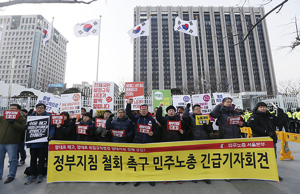 이기권 고용노동부 장관이 22일 오후 정부세종청사 공용브리핑룸에서 긴급 기자회견을 열어 노동개악의 핵심 쟁점인 '일반해고'와 '취업규칙 변경요건 완화'에 대한 양대 지침을 발표했다. 이에 민주노총은 서울 세종로 정부서울청사를 비롯한 전국 노동청 앞에서 긴급 기자회견을 열고 정부의 양대지침 철회를 촉구했다.