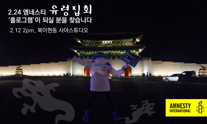 국제앰네스티 역시 지난 1월 25일 청와대 인근에서 집회를 개최하겠다고 신고했지만 ‘교통방해’를 이유로 금지되었습니다. 집회시위의 자유가 제대로 보장되지 않고 있기 때문입니다. 2월24일 오후 6시30분 광화문 북측광장(경복궁 정문 건너편)에서 홀로그램 영상을 통한 ‘2.24 앰네스티 유령집회’를 개최해, 집회시위의 자유를 요구하는 시민들의 뜻을 전달할 예정입니다. 관심있는 여러분의 적극적인 참여를 기다립니다!