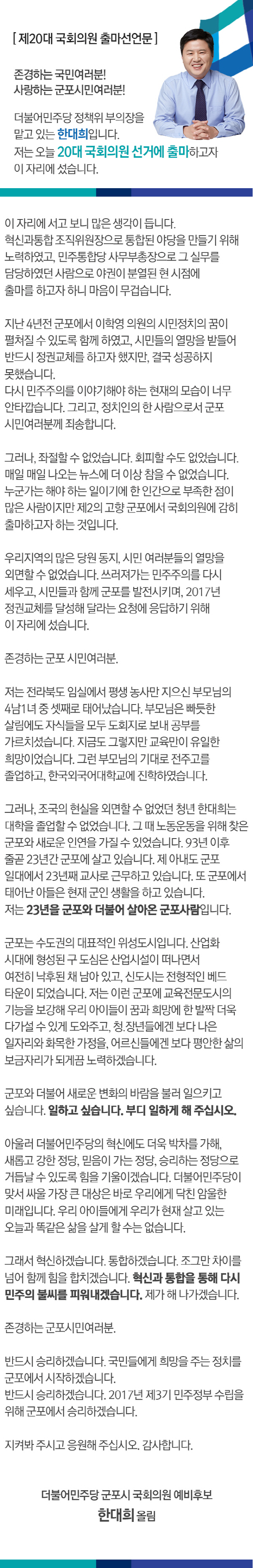 목, 2016/01/28- 13:32 에 익명 (미확인) 에 의해 제출됨 지역 군포시 한대희(韓大熙) 국회의원 인물정보 한대희(韓大熙) 지역 군포시 국회의원 선거구 경기도/군포시갑 정당 더불어민주당 신분 정당인 [0] 도시 경기도 지역구 군포시갑 Tags 인사말 출마선언문 출처 http://blog.naver.com/hdhi81/220611220732 Like 0 Dislike 0 360 views