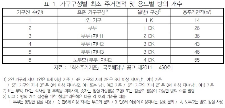 다음으로 제17조(최저주거기준의 설정)의 내용을 살펴보면 “① 국토교통부장관은 국민이 쾌적하고 살기 좋은 생활을 하기 위하여 필요한 최소한의 주거수준에 관한 지표로서 최저주거기준을 설정·공고하여야 한다. ② 제1항에 따라 국토교통부장관이 최저주거기준을 설정·공고하려는 경우에는 미리 관계 중앙행정기관의 장과 협의한 후 주거정책심의위원회의 심의를 거쳐야 한다. 공고된 최저주거기준을 변경하려는 경우에도 또한 같다. ③ 최저주거기준에는 주거면적, 용도별 방의 개수, 주택의 구조·설비·성능 및 환경요소 등 대통령령으로 정하는 사항이 포함되어야 하며, 사회적·경제적인 여건의 변화에 따라 그 적정성이 유지되어야 한다.”라고 되어 있다. 2011년에 개정공고된 최저주거기준(국토해양부 공고 제2011 – 490호)을 살펴보면 다음 표와 같다.