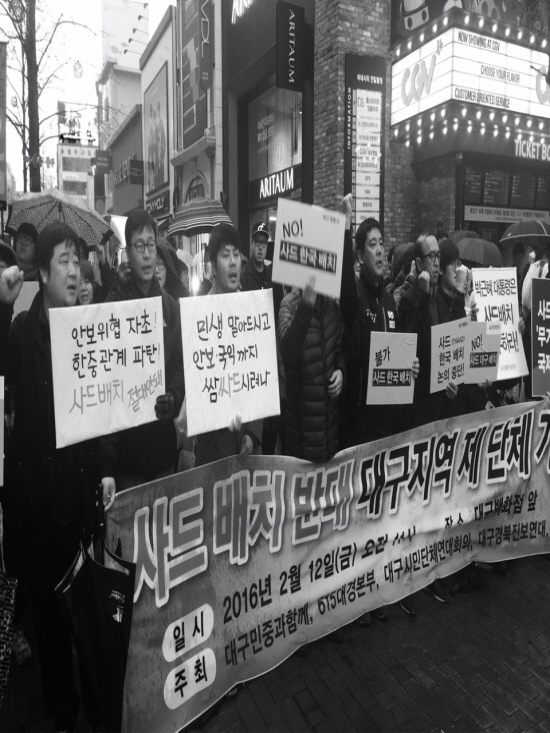 아울러 우리는 대구와 경북 왜관이 사드 배치의 최우선적 후보지로 오르내리고 있음을 우려한다. 주한미군이 2015년 사전 부지조사를 마친 후 왜관을 가장 선호했다는 보도도 가볍게 흘릴 수 없는 것이다. 미군기지로 도시발전이 가로 막히고 환경오염을 비롯한 온갖 불이익을 감수해온 마당에 사드 배치에 따른 기지와 시설의 제공, 사드 레이더의 강력한 전자파로 주민건강이 위협받게 할 수는 없는 일이다. 이에 우리는 대구시와 대구 경북 지역구 의원을 비롯한 여야 정치인 모두가 사드 배치 반대 입장을 조기에 명확히 밝힘으로써 국익과 안보를 지키는데 본연의 임무를 다할 것을 강력히 촉구한다.