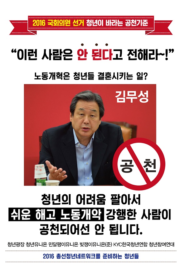 2. 청년유니온·민달팽이유니온·빚쟁이유니온(준)·KYC(한국청년연합)·청년참여연대·청년광장 6개 청년단체는 4월 국회의원 선거를 앞두고 ‘청년이 바라는 공천기준’을 제시하기 위해 2016년 2월 15일(월)부터 19일(금)까지 5일 동안 매일 정오(오후 12시)에 국회 정문 앞에서 릴레이 캠페인을 진행한다.