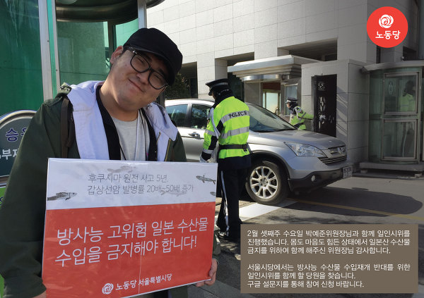 5년이 지난 지금 후쿠시마에서 암 확진 판정을 받은 이들의 비율이 전국 통상 발병률의 수십 배에 달한다고 합니다. 노동당서울시당에서는 작년에 이어 시간이 지날 수록 무뎌지는 방사능의 공포, 일본산 수산물 수입 반대를 위한 1인시위를 재개합니다.