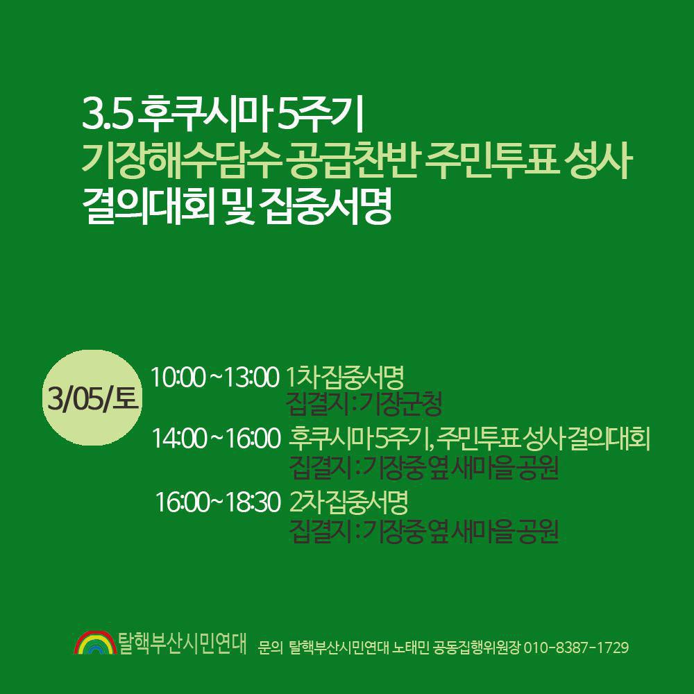 월, 2016/02/29- 12:10 에 익명 (미확인) 에 의해 제출됨 [0] 관련 개인/그룹 부산환경운동연합 지역 기장군 올해 후쿠시마5주기 탈핵시민한마당은 기장해수담수 주민투표 성사 결의대회로 진행하기로 했습니다! 후쿠시마5주기 탈핵시민한마당 -일시 : 2016년 3월 5일(토) 14:00~ -장소 : 기장 새마을공원(기장중 옆) -주최 : 탈핵부산시민연대 (※ 오전10시부터는 주민투표 선거인명부 동의 서명활동이 있습니다) 링크 http://pusan.kfem.or.kr/bbs/bbs/board.php?bo_table=bo01&wr_id=1047 Tags 탈핵부산시민연대 후쿠시마5주기 기장해수담수화 Like 0 Dislike 0 871 views 댓글 달기 이름 제목 Comment 저장 Preview