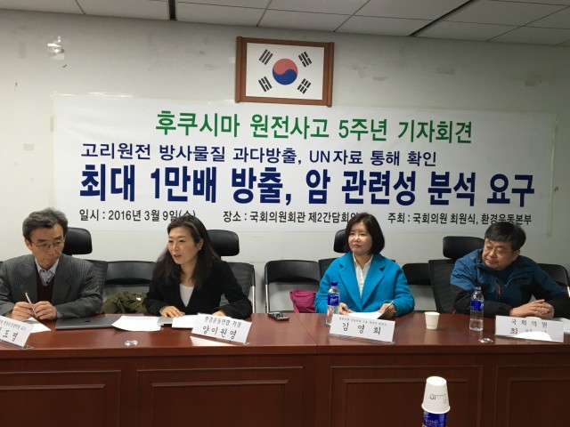 ○ 장소: 국회 의원회관 제2간담회실(202호) ○ 주최: 국회의원 최원식, 환경운동연합 ○ 참가자: 국회의원 최원식(미래창조과학방송통신위원회) 백도명 교수(서울대환경보건대학원) 김영희 변호사(원전주변 갑상선암 소송 대리인) 양이원영 처장(환경운동연합) |