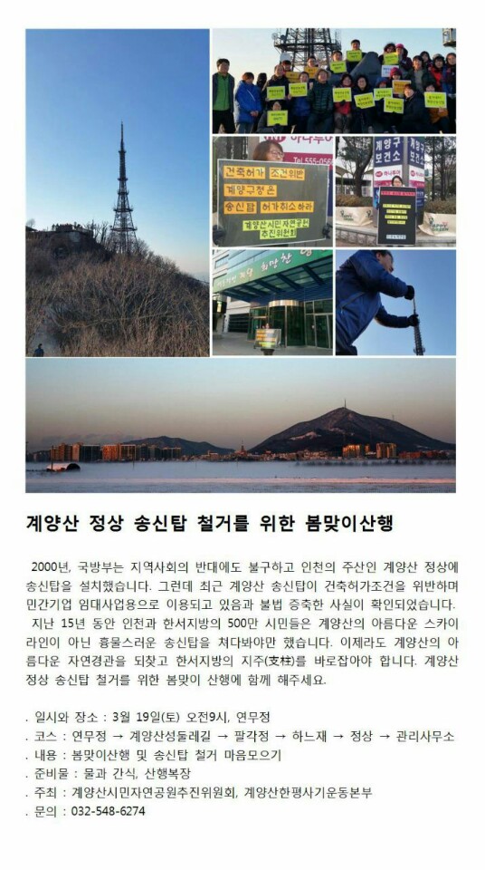 목, 2016/03/17- 14:14 에 익명 (미확인) 에 의해 제출됨 [0] 관련 개인/그룹 인천환경운동연합 지역 인천 미추홀 링크 http://inchon.ekfem.or.kr/archives/10205 Tags 알림마당 계양산 계양산성둘레길 송전탑 계양산 송전탑 Like 0 Dislike 0 450 views 댓글 달기 이름 제목 Comment 저장 Preview