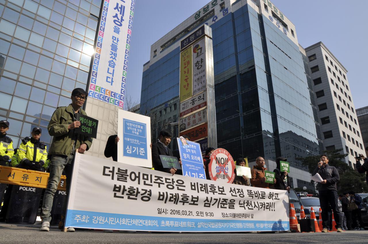 9시30분, 여의도 더불어민주당사 앞에서 진행된 기자회견은 녹색연합 윤상훈 사무처장의 발언으로 시작했다. 윤 처장은 심기준 후보가 낙천되어야 하는 이유를 지적했다. 산으로 간 4대강 사업인 설악산케이블카 사업을 강원도당 위원장으로서 거짓말과 자당 소속 의원들에 대한 겁박으로 독려한 행위는 비례대표 후보로서 부합하지 않는다는 것이다. 더욱이 더불어민주당의 여러 국회의들이 문제로 지적한 사업에 대해 당론 채택여부 등을 놓고 거짓말을 한 것은 분명 해당행위에 해당하며 더불어민주당의 여러 의원들과 정체성을 달리하는 것이라는 점을 강조했다.