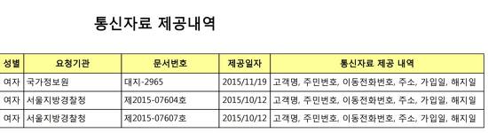 2016년 3월 15일 이동통신사로부터 정보공개센터 활동가의 통신자료 제공사실 확인서가 도착했습니다. 국가정보원에서 1건, 서울지방경찰청에서 2건의 통신자료제공 요청이 있었습니다. 이에 해당 자료제공을 요청한 사유에 대하여 정보공개청구를 진행했습니다.