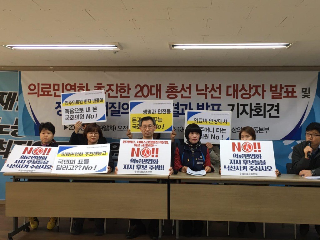 ○ 우리는 이번 20대 국회의원 입후보자 중 지난 19대 국회 때 의원 발의를 통해 의료민영화를 추진한 국회의원들을 중심으로 낙선운동의 대상으로 삼고자 하며, 이외에도 진주의료원 폐원에 앞장 선 자들과 그간 기자회견 및 각종 국회 대정부 질의 등에서 명확한 의료민영화 사안을 지지하고, 이를 강행시키려 한 19대 국회의원들을 대상에 포함시키려 함.