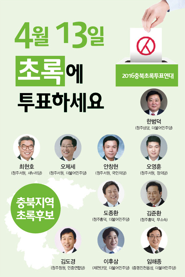 3월달에 ’2016충북초록투표연대’를 결성하였고, 시민들로부터 공약을 제안받고 참여단체별로도 환경의제를 제안받아 12개 공통의제, 5개 지역의제로 ’4,13총선 충북지역 환경정책의제’를 작성하였습니다. 환경정책의제를 충북지역 8개 선거구 26명의 국회의원 후보 모두에게 정책공약으로 채택해 줄 것을 제안하였습니다.