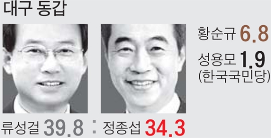 중앙일보와 엠브레인이 지난달 29일 실시한 4·13 총선 5차 여론조사(각 지역 유권자 600명 대상)에서 대구 동갑의 ‘유승민계’ 류성걸(무소속) 후보가 지지율 39.8%, 이른바 ‘진박’ 정종섭 후보가 34.3%로 나타났다. 오차범위(±4.0%포인트) 안이지만 류 후보가 5.5%포인트 높았다.