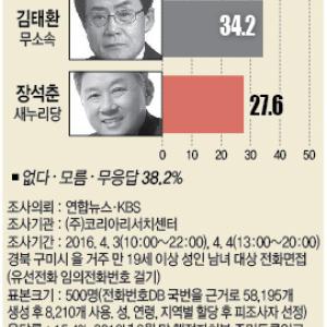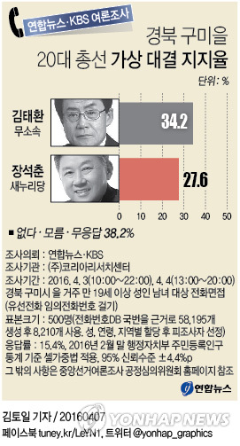 연합뉴스와 KBS가 코리아리서치에 의뢰, 지난 3∼4일 이 지역 유권자 500명을 대상으로 실시해 7일 발표한 여론조사 결과(95% 신뢰수준에서 ±4.4%포인트)에 따르면 김 후보는 34.2%의 지지율로 장 후보(27.6%)를 6.6%포인트 따돌렸다.