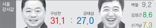 강서갑(3~4일 조사)은 18대 의원을 지낸 새누리당 구상찬(31.1%) 후보와 2012년 안철수 대선캠프 대변인 출신 더민주 금태섭(27.0%) 후보가 오차범위 내 접전 중이다. 이 지역도 국민의당 김영근(8.6%), 민주당 신기남(7.3%), 무소속 백철(9.2%) 후보 등이 있었지만 새누리당과 더민주 후보 간 대결 구도다. 적극투표층에선 구상찬 33.4%-금태섭 30.6%로 격차가 더 좁혀졌다.