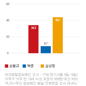 YTN 여론조사 결과 정의당 심상정 후보가 43.7, 새누리당 손범규 후보 34.3%로 심 후보가 오차범위를 넘는 우세를 보였습니다.