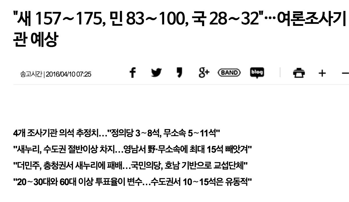 연합뉴스 - 4.13 총선 판세.."새 157∼175, 민 83∼100, 국 28∼32"…여론조사기관 예상