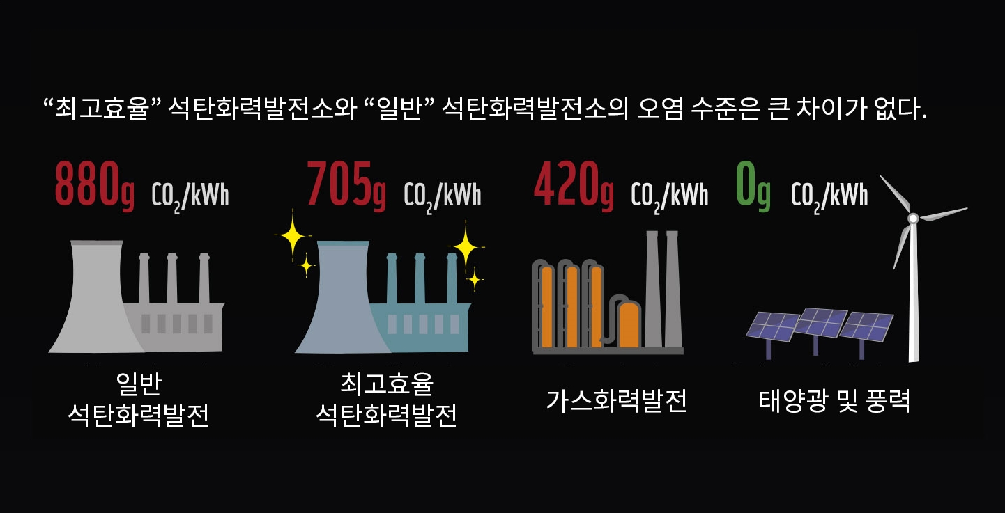 한국, 일본, 독일을 비롯한 정부와 발전회사는 고효율 석탄화력발전소를 기후변화 대응 수단으로 제시해왔다. 고효율 석탄화력발전은 초임계, 초초임계, 석탄가스화복합발전(IGCC) 등 기술을 포괄한다. 하지만 아무리 효율을 높이더라도 석탄화력발전소 확대는 위험한 기후변화로 이어질 수밖에 없다는 것이 에너지·환경 전문 컨설팅 회사 에코피스(Ecofys)의 보고서 ‘2도 시나리오에 상반되는 고효율 석탄화력 기술’의 결론이다.[1]