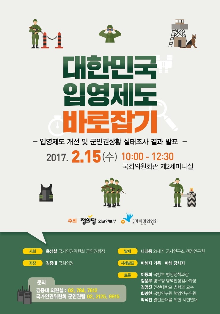정의당 외교안보본부장 김종대 의원과 국가인권위원회(이하 인권위)는 15일 오전 10시 국회 의원회관 제2세미나실에서 「대한민국 입영제도 바로잡기」 토론회를 공동으로 열어 지난해 인권위가 수행한 ‘입영제도 개선방안 마련에 대한 실태조사 결과’를 발표한다.