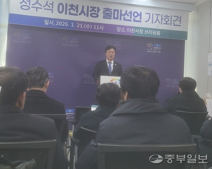 성수석(56) 더불어민주당 경기 이천시지역위원장이 21일 이천시청 브리핑룸에서 기자회견을 갖고 6.3지방선거 이천시장 출마를 선언했다.성 위원장은 “말이 아닌 결 …