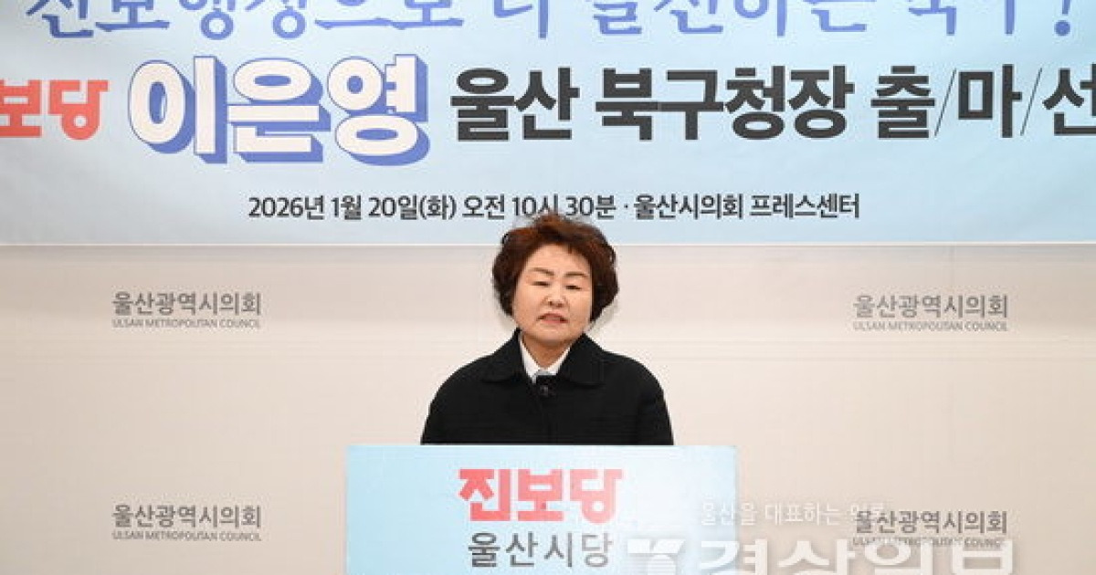 진보당 이은영 전 울산시의원이 제9회 전국동시지방선거에서 울산 북구청장 후보로 출마한다고 공식 선언했다. 이 전 시의원은 20일 울산시의회 프레스센터에서 기자회견을 열고 "…