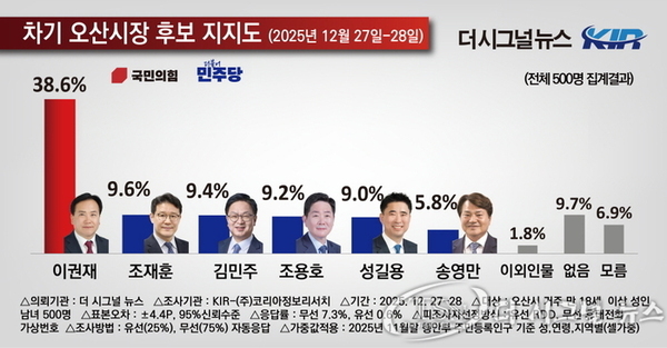 내년 제9회 전국동시지방선거를 앞두고 실시된 오산시 여론조사 결과, 이권재 현 오산시장이 차기 시장 적합도와 시정 운영 평가에서 모두 우위를 점하