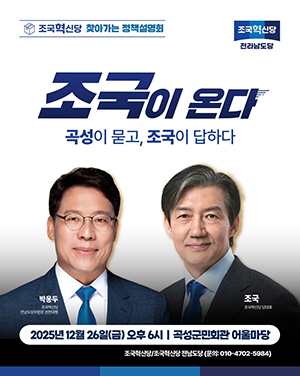 조국혁신당이 2026년 6·3 전국동시지방선거를 앞두고 전남 곡성에서 지역 밀착형 정책설명회를 연다.조국혁신당은 오는 12월 26일(금) 오후 6시, ‘곡성군 군민회관’ 어울마당…