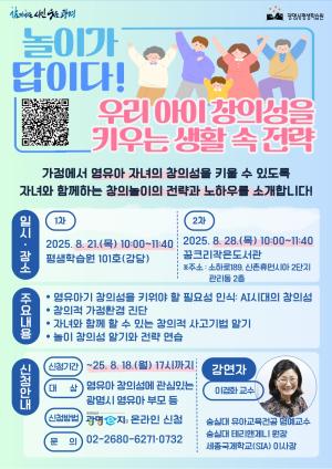 광명시(시장 박승원) 평생학습원은 오는 29일부터 ‘놀이가 답이다! 우리 아이 창의성을 키우는 생활 속 전략’ 프로그램 학습자 100여 명을 모집한다.이번 프로그램은 ‘…