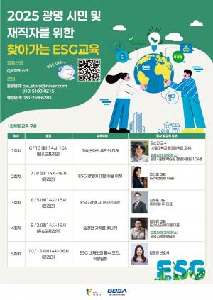 광명시(시장 박승원)는 ‘시민과 기업이 함께하는 환경·사회·지배구조(ESG) 실천’을 주제로 ‘찾아가는 ESG 교육’을 진행한다.교육은 오는 10월까지 매월 둘째 주 화요일(…
