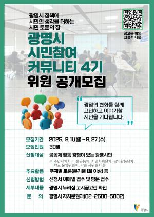 광명시(시장 박승원)는 11일부터 27일까지 시민과 함께 정책 해법을 찾는‘시민참여 커뮤니티’ 4기 위원을 모집한다.시민참여 커뮤니티는 시민 눈높이에서 다양한 지역문제를 논의하고…