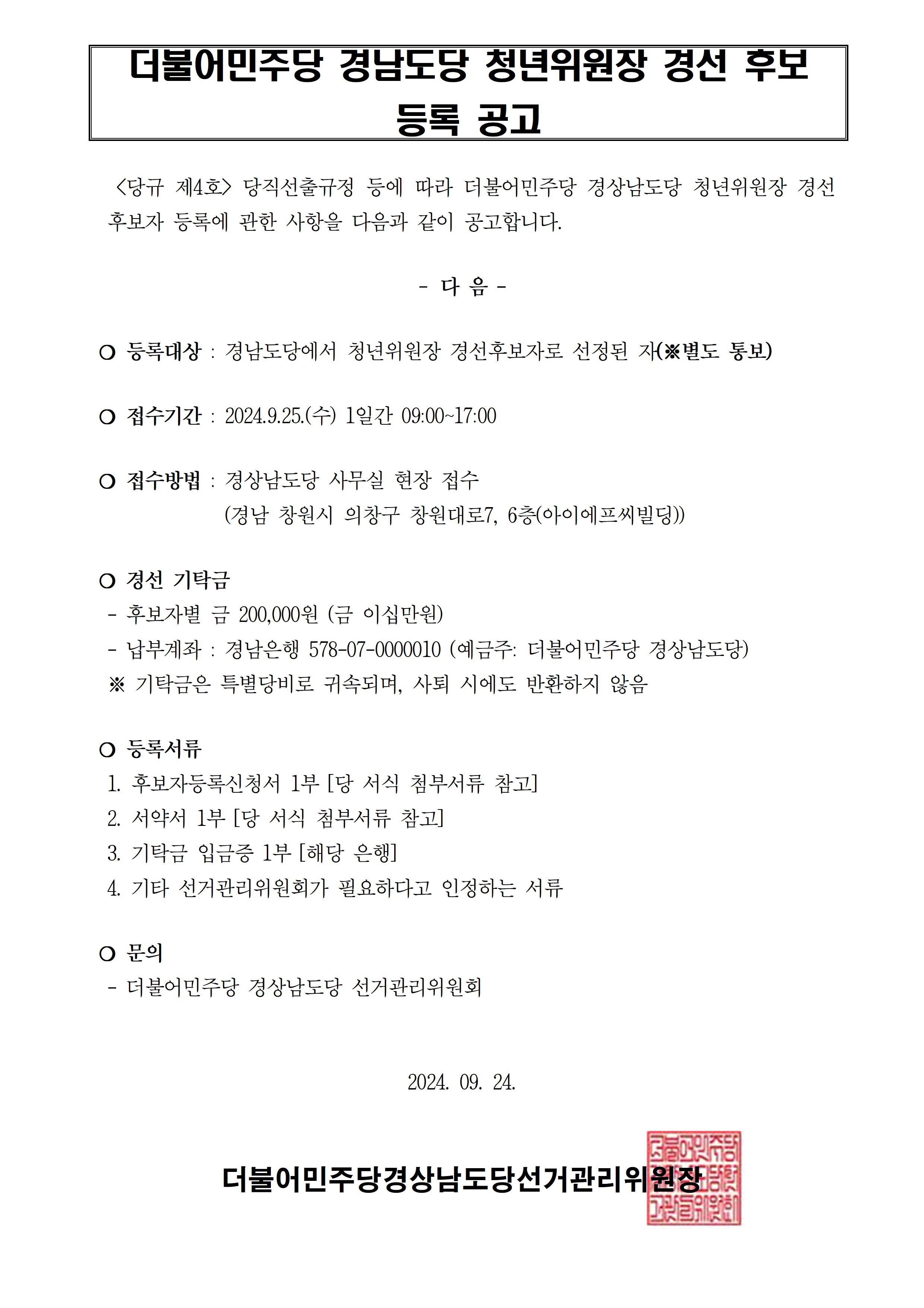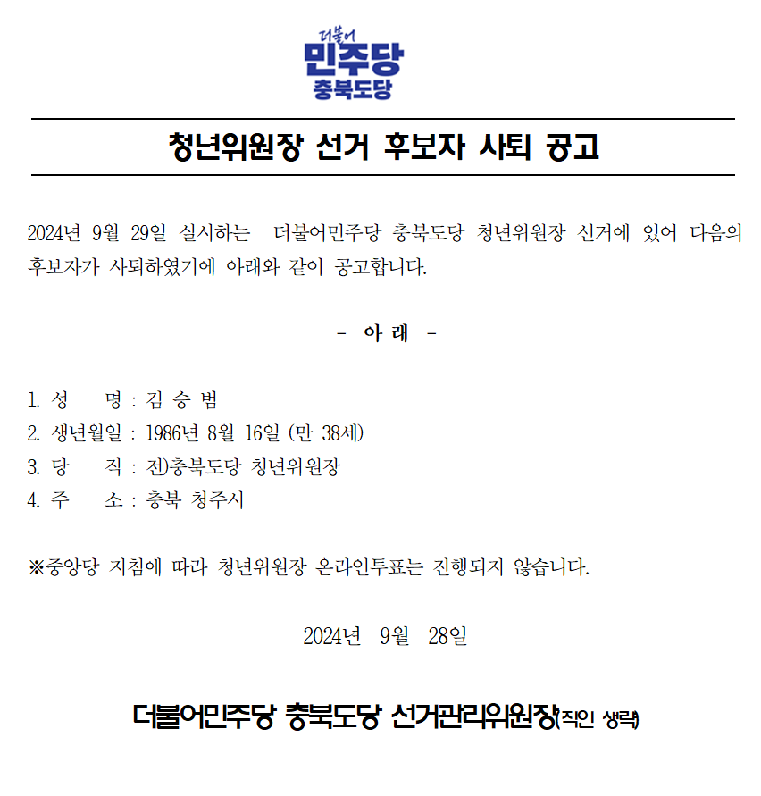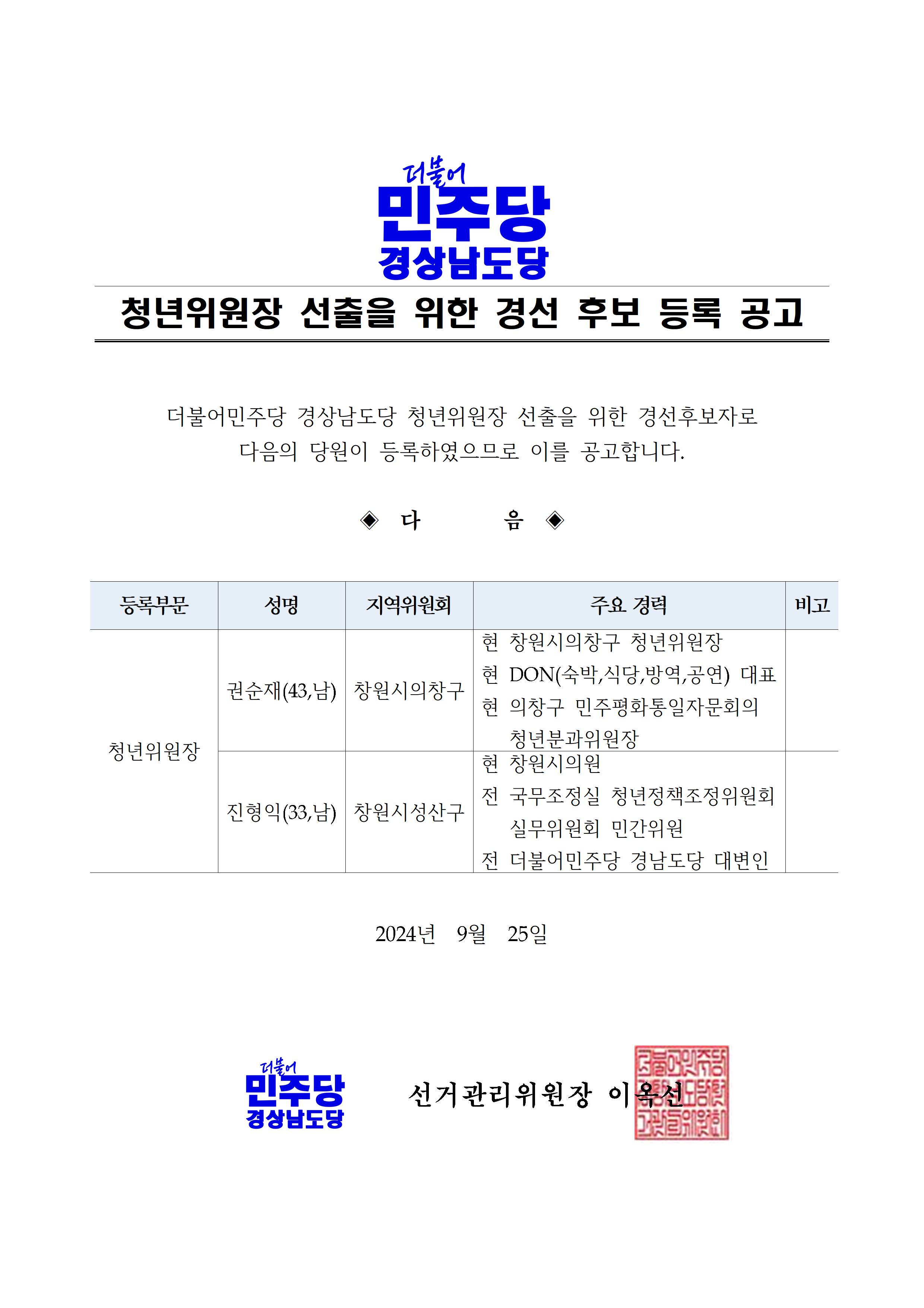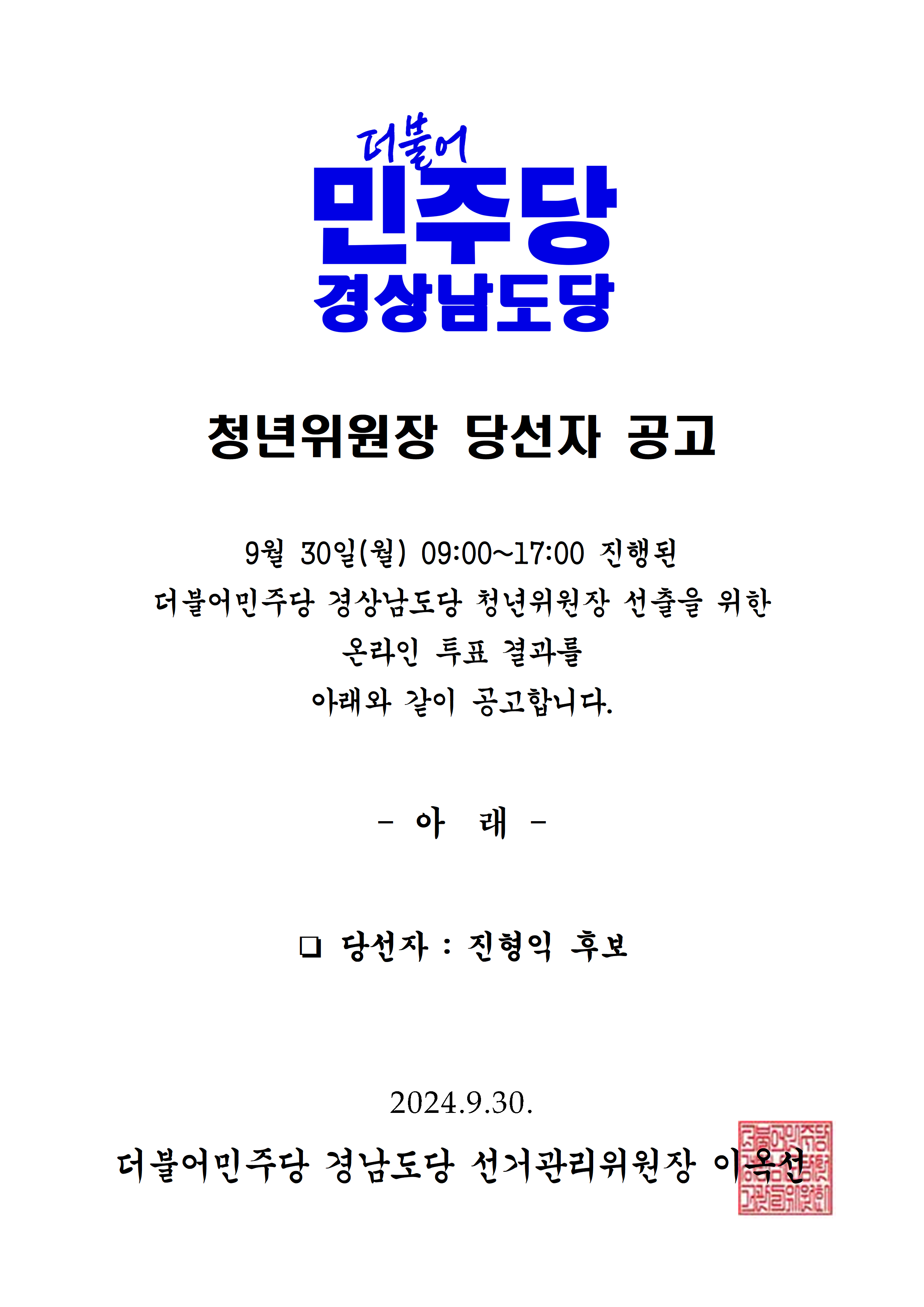 민주당 경남도당 - [공고] 청년위원장 당선자 공고