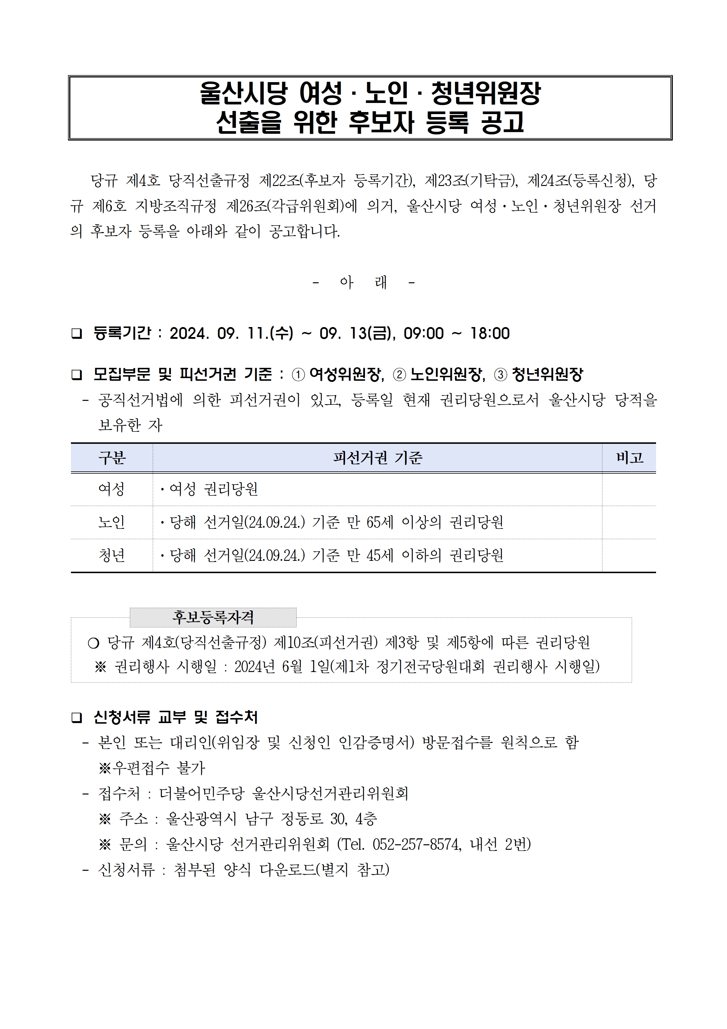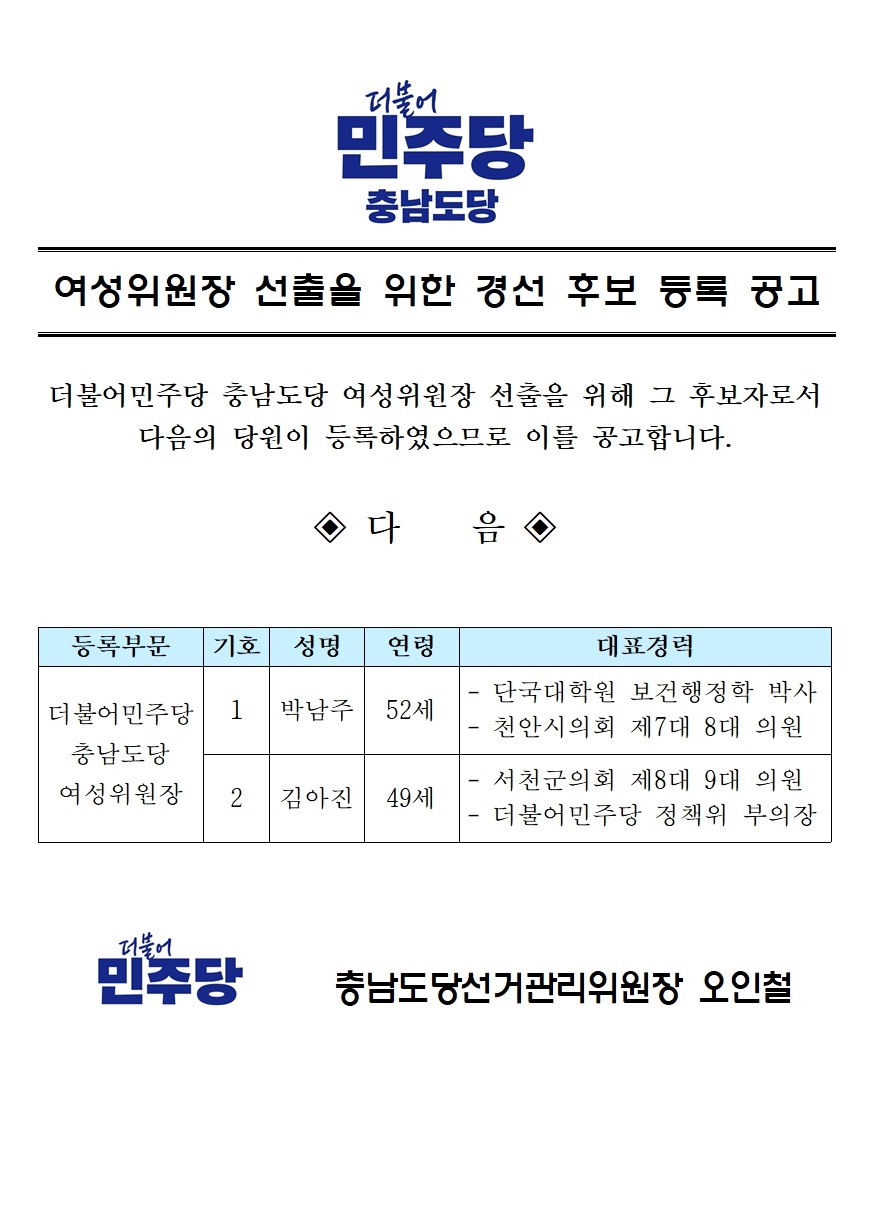 민주당 충북도당 - 전국위원회급 위원장(여성․노인․청년) 후보자등록신청 공고