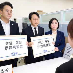 충남대전통합특별법안 · 전남광주통합특별법안 제출하는 민주당. © 6·3 지방선거를 4개월 앞두고 광역단체의 행정통합 추진이 잇따르면서 지방선거