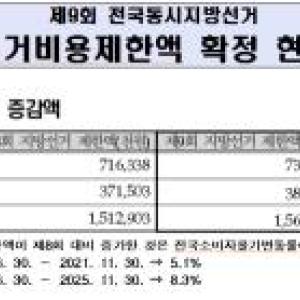 [충청뉴스 김용우 기자] 대전·세종·충남선거관리위원회는 6월 3일 실시하는 제9회 전국동시지방선거 후보자가 선거운동을 위해 지출할 수 있는 비용의 한도액(이하 ‘선거비용제한액’)…