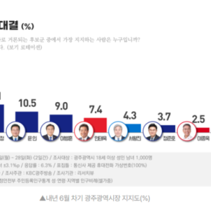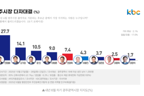 ▲차기 광주광역시장 지지도(%)내년 6월 차기 광주광역시장을 뽑는 지지도 대결에서 더불어민주당 민형배 의원이 다른 후보들을 오차 범위 밖으로 따돌렸다.KBC 광주방송에 따르면…