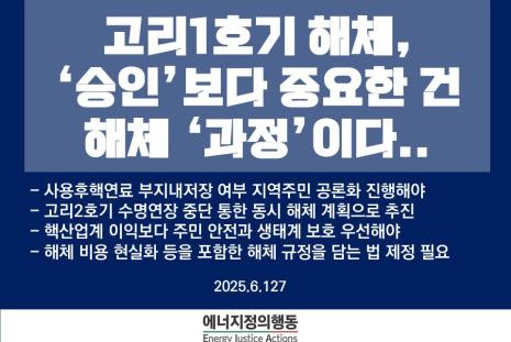 고리1호기 해체 ‘승인’보다 중요한 건 해체 과정이다.사용후핵연료 부지내저장 여부 지역주민 공론화 진행해야고리2호기 수명연장 중단 통한 동시 해체 계획으로 추진핵산업계 이익보다…