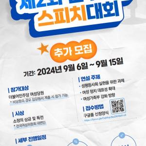 [제2회 민주여성스피치대회] 추가 모집❏ 모집기간 : 9월 6일(금) ~ 9월 15일(일)❏ 접수방법 : 구글폼 (https://vvd.bz/ftqQ)※ 오리엔테이션 및 특강…